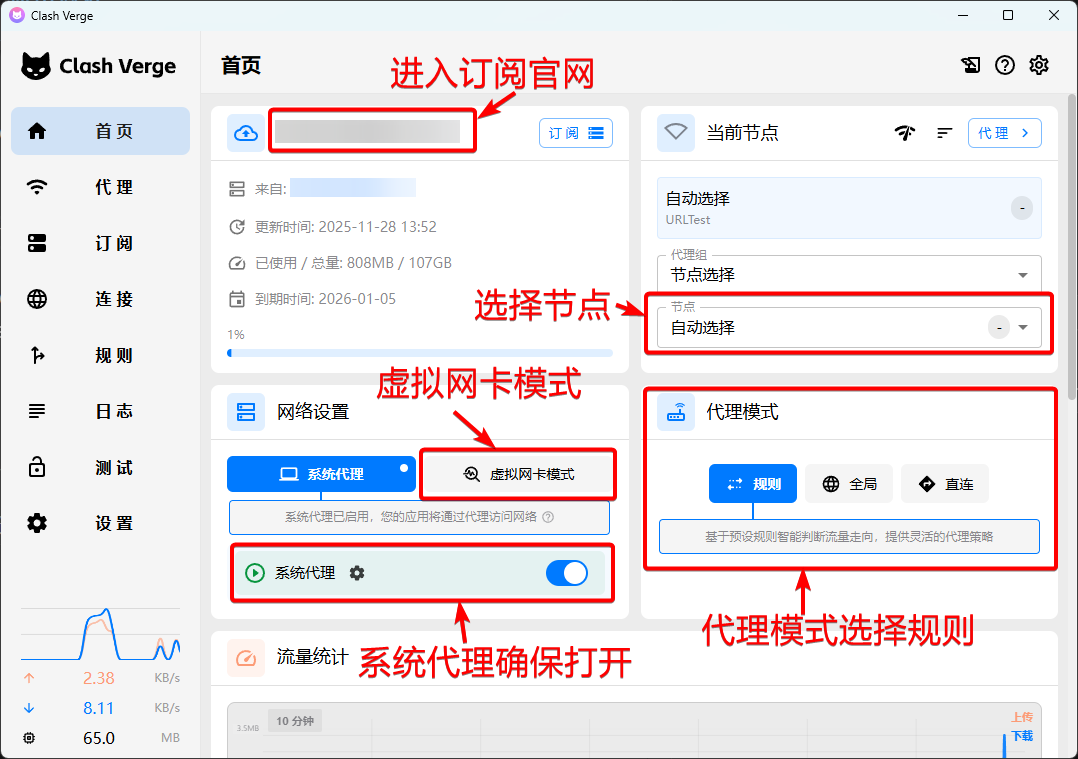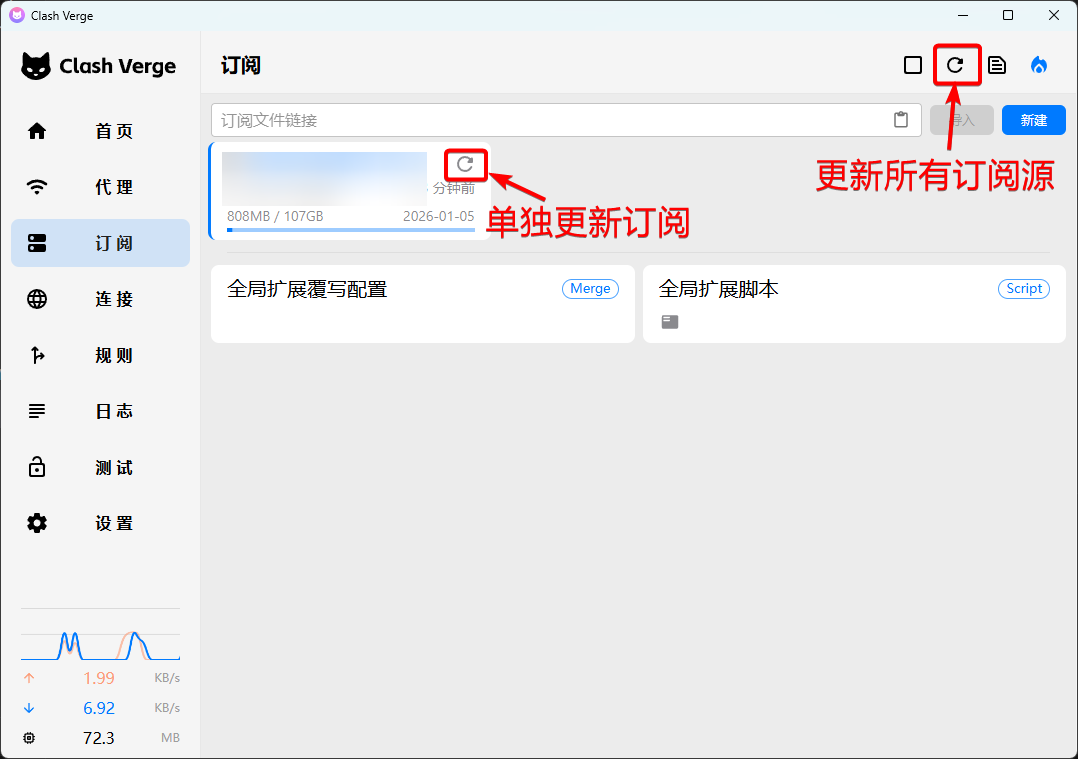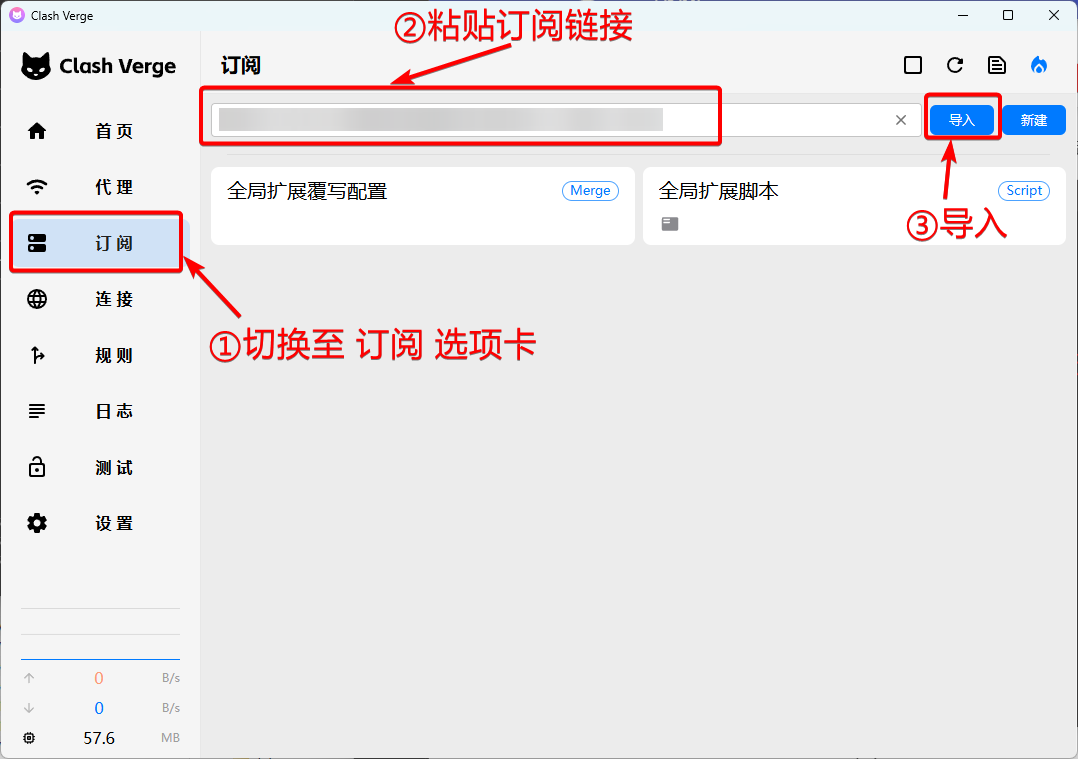 打开Clash Verge,切换到订阅选项卡,粘贴订阅链接,点击导入完成订阅