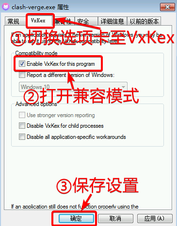 切换选项卡至 VxKex,打开 Enable VxKex for this program。